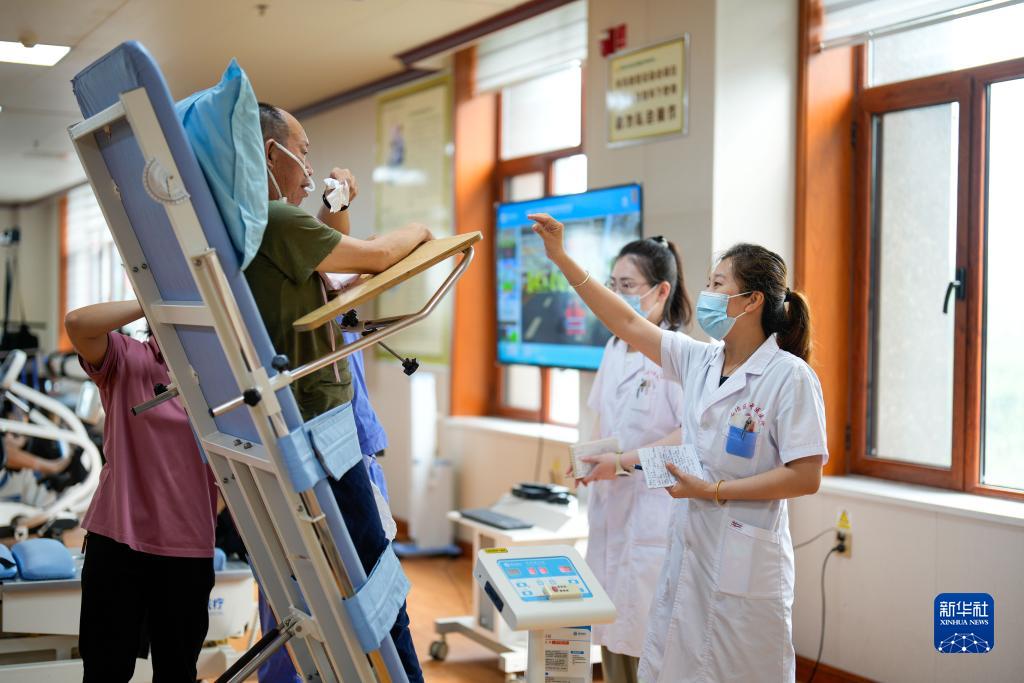 9月12日,河北省唐山市古冶區一家養老機構的工作人員指導老人進(jìn)行康復訓練。