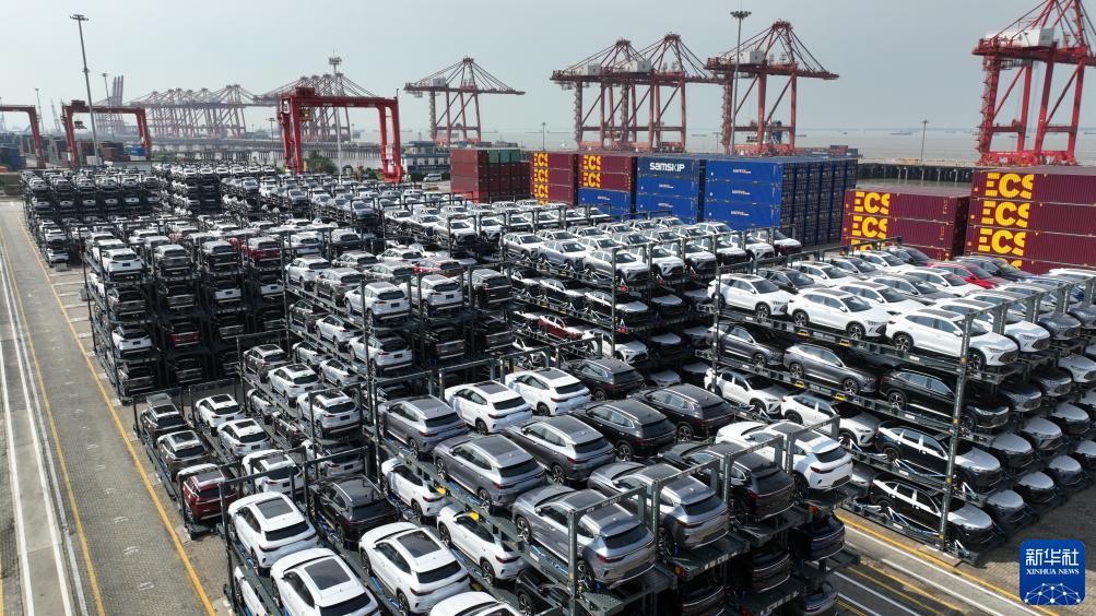 在江蘇省太倉港國際集裝箱碼頭,一批新能源汽車(chē)即將通過(guò)專(zhuān)用框架運輸方式出口(2023年7月11日攝,無(wú)人機全景照片)。