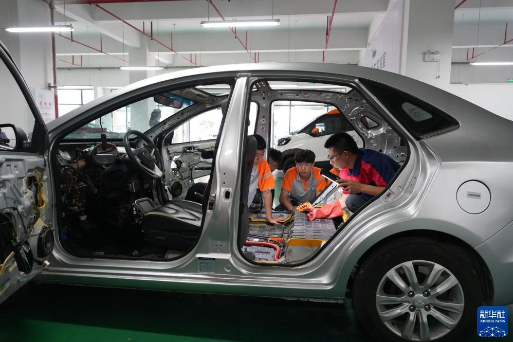9月12日,在重慶市北碚區職業(yè)教育中心新能源汽修實(shí)訓室,教師(右一)在給學(xué)生講解新能源汽車(chē)維修知識。