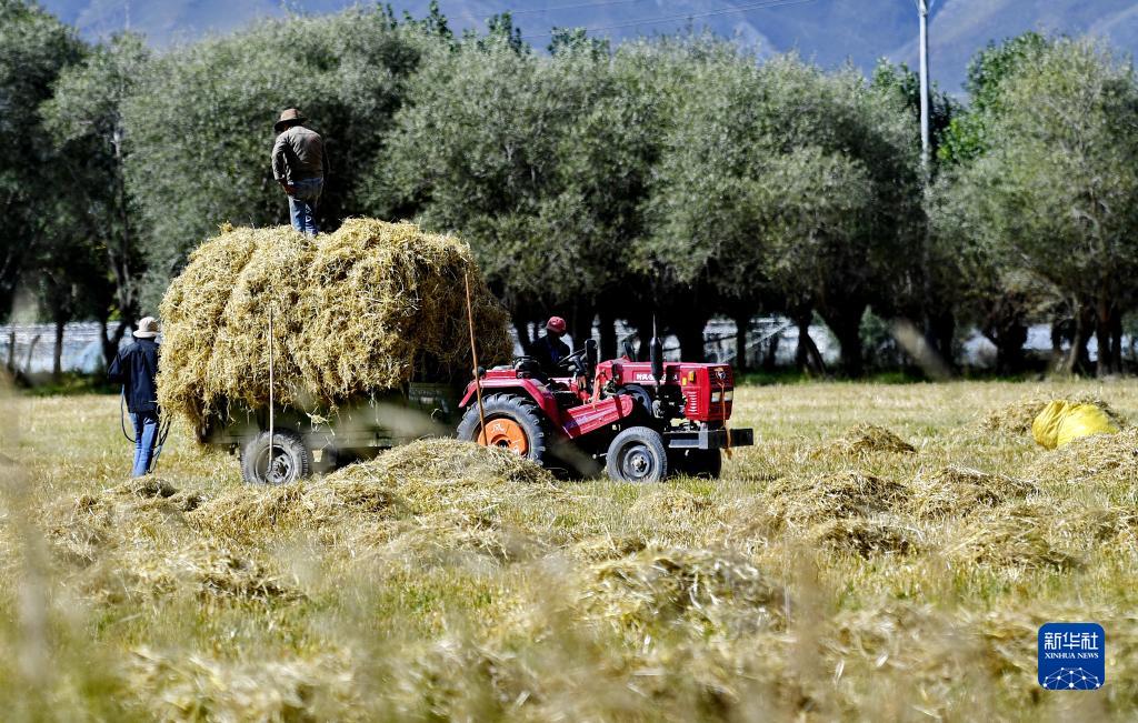 曲水縣才納鄉白堆村村民將青稞秸稈裝上拖拉機,準備運出田地(9月11日攝)。