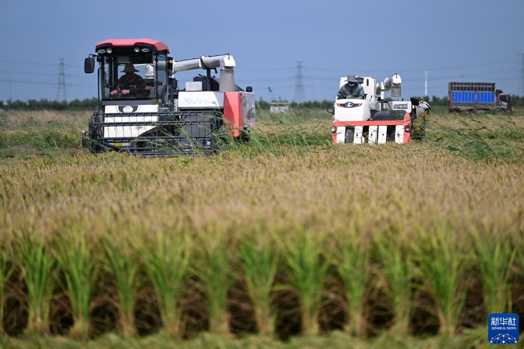 9月12日,收割機在天津市西青區王穩莊鎮的稻田里作業(yè)。