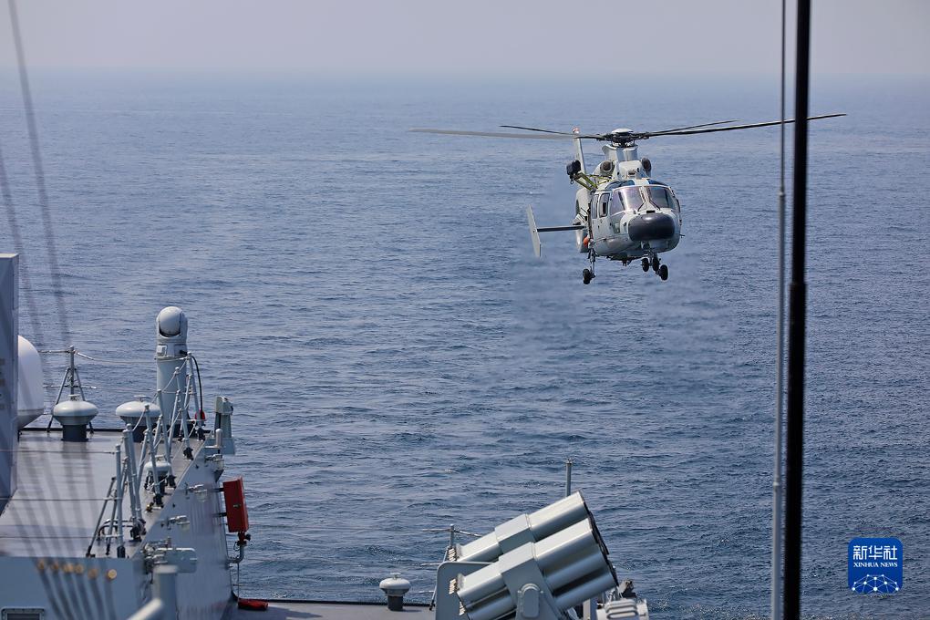中國海軍第45批護航編隊在任務(wù)準備期間組織艦載直升機起降訓練(8月25日攝)。