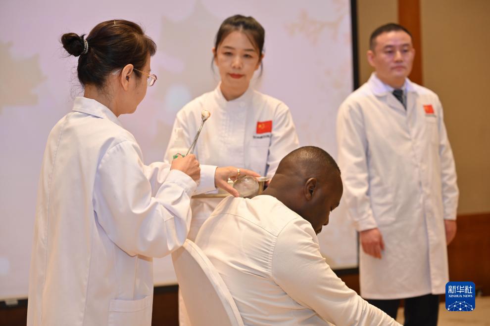 9月11日,在科威特大穆巴拉克省,中國(吉林)第15批援科威特醫療隊隊員在紀念儀式現場(chǎng)展示中醫拔罐。