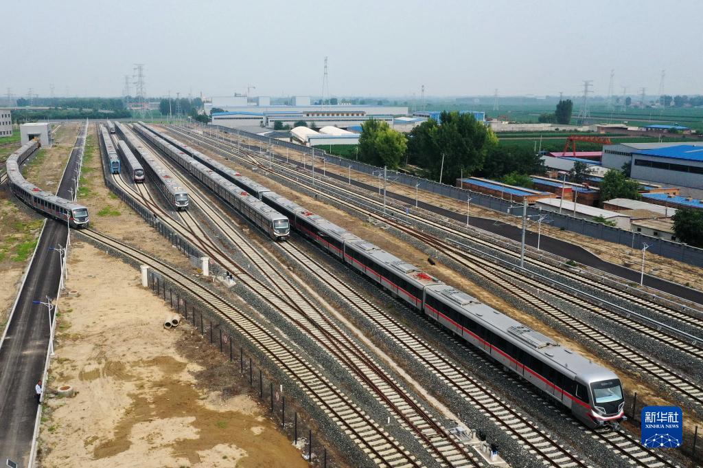 7月27日在河北省保定市滿(mǎn)城區河北京車(chē)智能制造基地試車(chē)場(chǎng)拍攝的地鐵列車(chē)(無(wú)人機照片)。