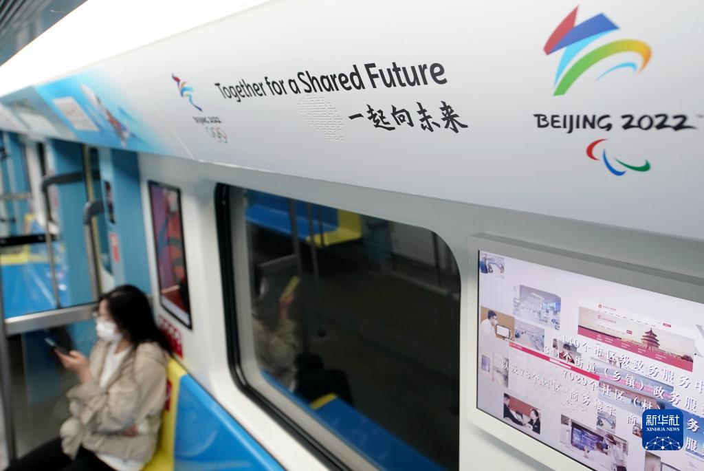 這是9月13日拍攝的北京地鐵11號線(xiàn)(冬奧支線(xiàn))列車(chē)車(chē)廂內部的冬奧元素裝飾。