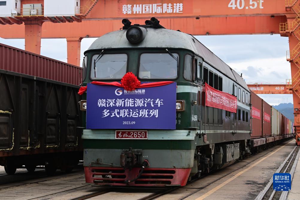 9月13日,在江西贛州國際陸港,贛深新能源汽車(chē)多式聯(lián)運專(zhuān)列準備啟程開(kāi)往深圳鹽田港。