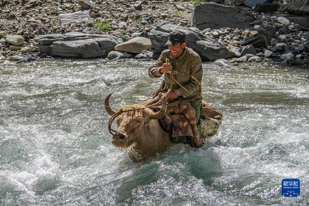 2012年9月21日,拉齊尼騎著(zhù)牦牛在巡邏路上淌過(guò)湍急的河流。新華社發(fā)(王烈 攝)