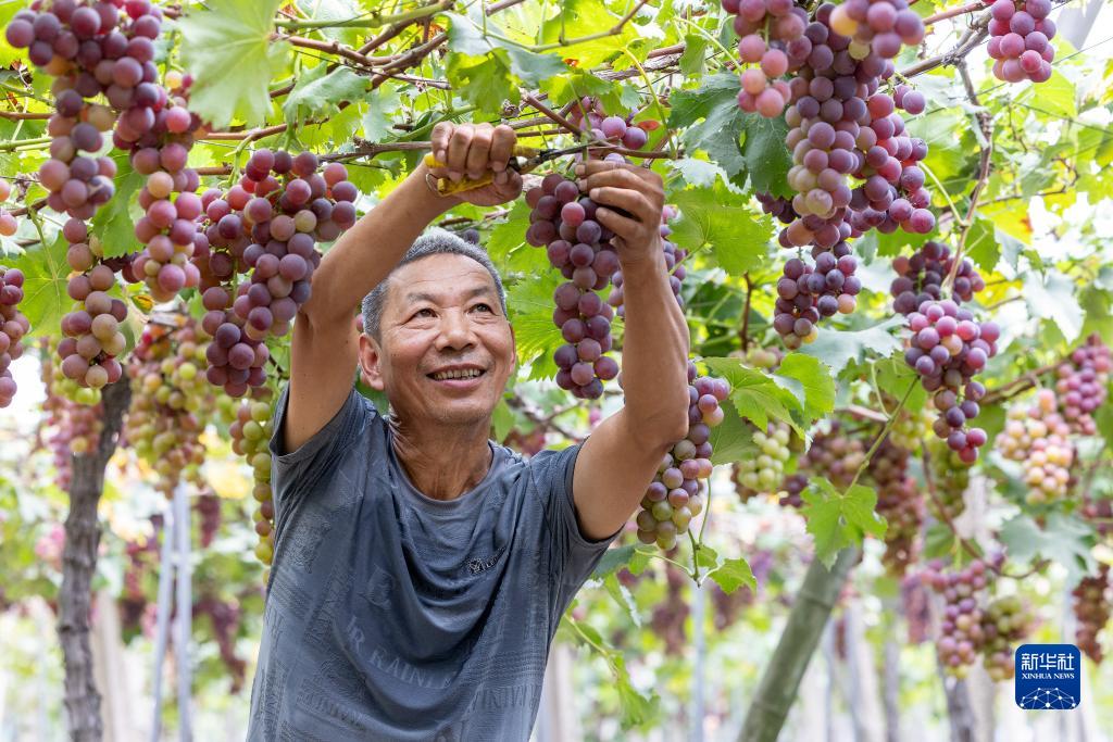 9月13日,浙江省諸暨市安華鎮新州村的果農在采摘巨峰葡萄。