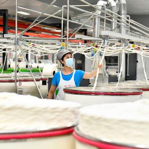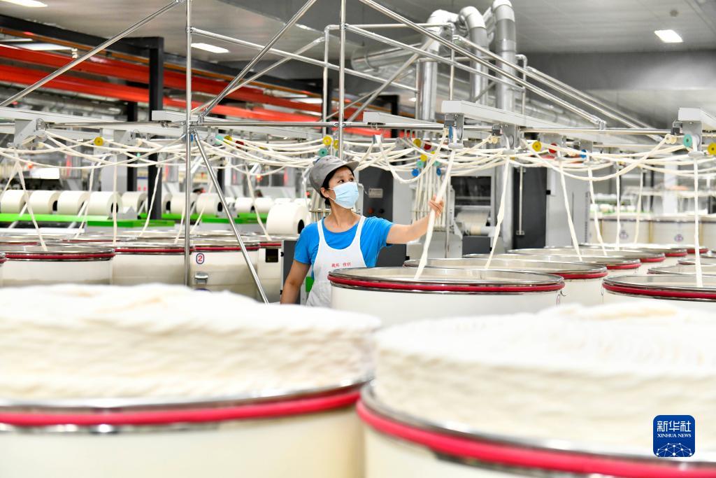 9月13日,在山東宏儒紡織科技有限公司綠色智能化生產(chǎn)車(chē)間,工作人員在加工高端紗線(xiàn)。