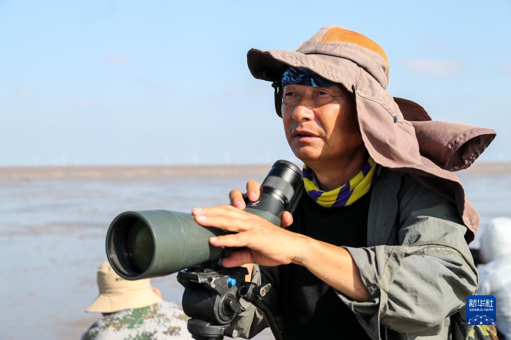李東明(右)在東臺條子泥灘涂上調查拍攝鳥(niǎo)類(lèi)(2023年8月19日攝)。鳥(niǎo)類(lèi)調查員、攝影師李東明1963年出生,原本經(jīng)營(yíng)著(zhù)一家圖文社,從2009年開(kāi)始觀(guān)察、拍攝候鳥(niǎo)。2019年,他成為東臺條子泥濕地的一名鳥(niǎo)類(lèi)調查員,起早摸黑,風(fēng)吹雨打,通過(guò)攝影積累了大量圖片與視頻資料,更是多次觀(guān)察拍攝到全球僅剩600余只的勺嘴鷸,大家都稱(chēng)他為“勺子王”“鳥(niǎo)博士”。目前條子泥濕地記錄的412種鳥(niǎo)中,他已拍到200余種。新華社記者 楊磊 攝