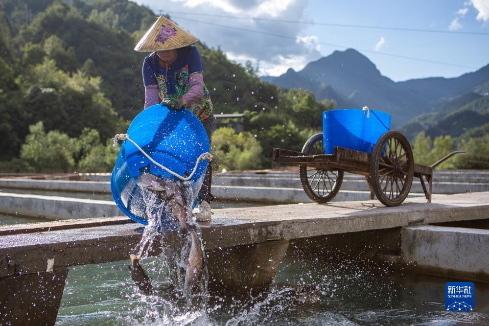 9月13日,在重慶市城口縣蓼子鄉明安村冷水魚(yú)產(chǎn)業(yè)基地,工人對分選的虹鱒魚(yú)進(jìn)行換池。