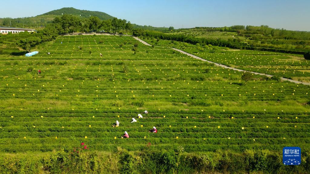 9月14日,在山東省諸城市桃林鎮,茶農在茶園里采摘秋茶(無(wú)人機照片)。