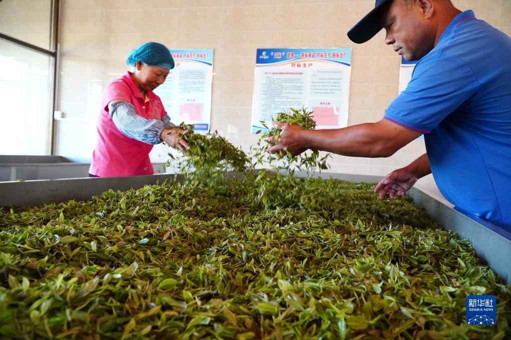 9月14日,在山東省諸城市桃林鎮,茶農在加工采摘的秋茶。