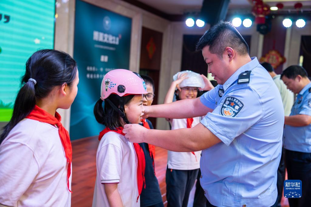 9月14日,在新世博寄宿制小學(xué),交警指導學(xué)生佩戴安全頭盔。