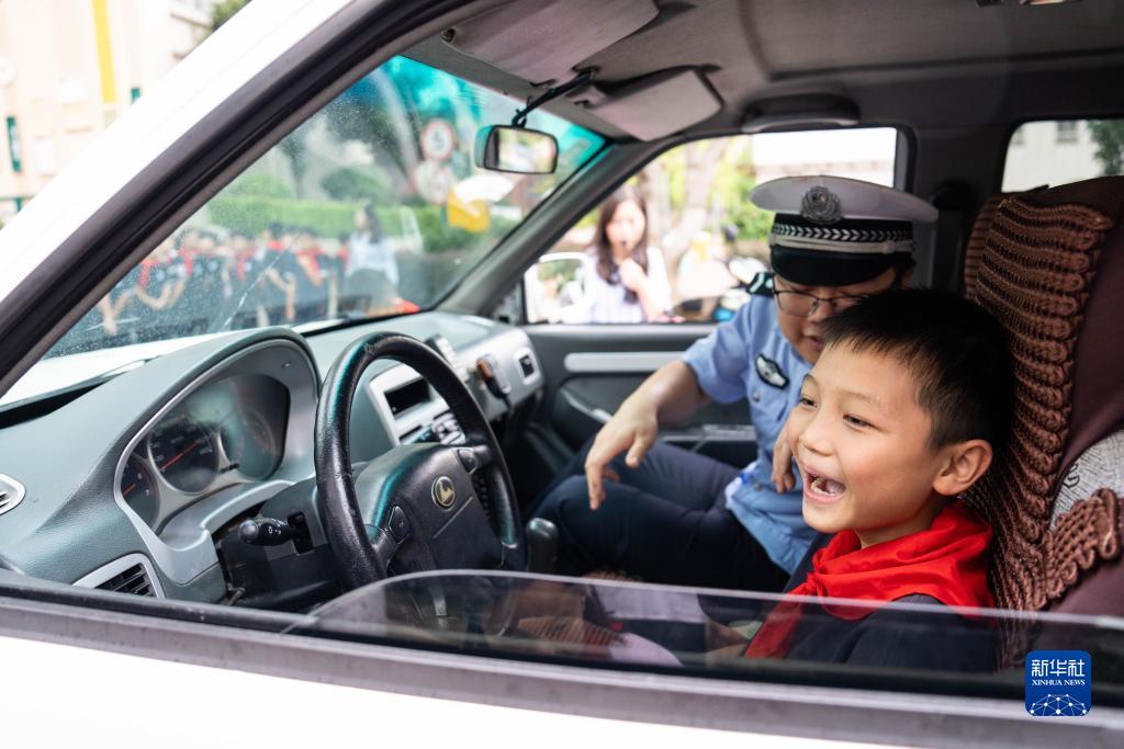 9月14日,在新世博寄宿制小學(xué),一名學(xué)生在汽車(chē)駕駛位上感受視覺(jué)盲區。