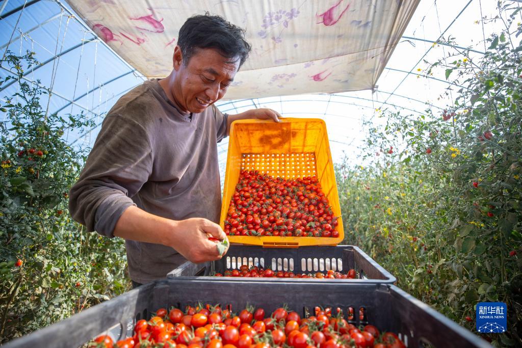 在吳忠市同心縣下馬關(guān)鎮的小番茄溫棚內,農民在分揀小番茄(9月14日攝)。