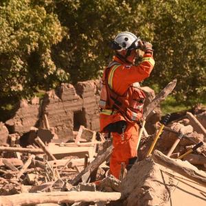 9月14日,救援人員在位于摩洛哥豪茲省的伊姆利勒村的地震廢墟上搜救。