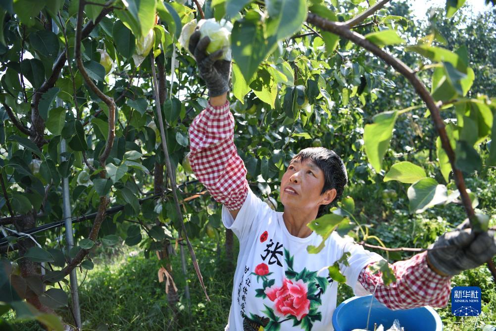 9月15日,農民在河北省玉田縣唐自頭鎮一處經(jīng)荒山開(kāi)發(fā)而建的果園內采摘鮮梨。