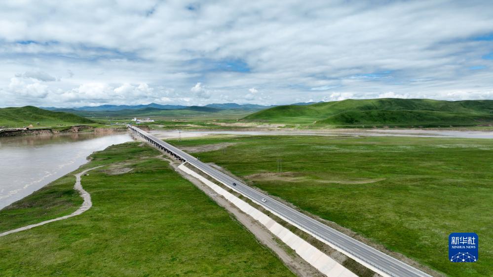 瑪曲縣城郊黃河岸邊的沙化帶已被牧草和灌木復綠(7月6日攝,無(wú)人機照片)。
