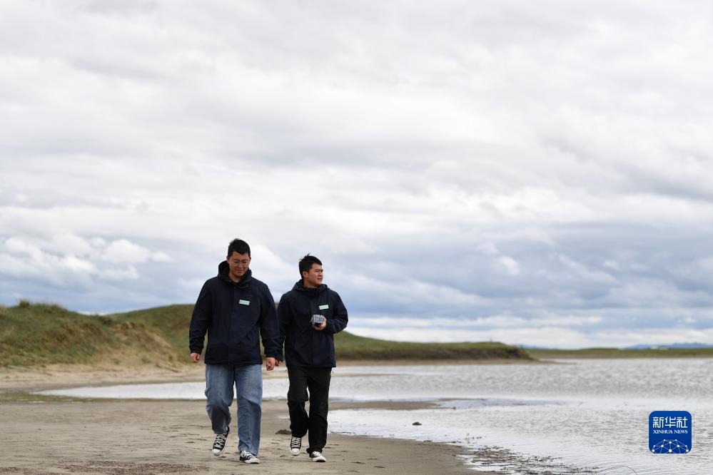 在甘南藏族自治州瑪曲縣,甘肅黃河首曲國家級自然保護區管護中心曼日瑪保護站工作人員王佳陽(yáng)(左)和同事在保護區內巡護(7月5日攝)。