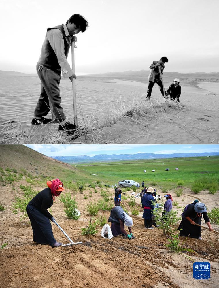 拼版照片:上圖為2002年參與防治沙漠化的工作人員在瑪曲縣黃河沿岸一處沙化草場(chǎng)上壓沙(新華社記者韓傳號攝);下圖為2023年7月6日,牧民在瑪曲縣黃河沿岸一處沙化草原治理點(diǎn)進(jìn)行草籽補種工作(新華社記者張可任攝)。
