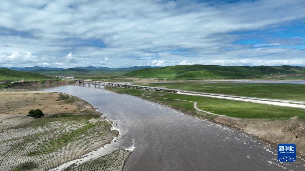 這是瑪曲縣城外黃河岸邊一處經(jīng)過(guò)治理修復的草場(chǎng),已種植上牧草和灌木(7月6日攝,無(wú)人機照片)。
