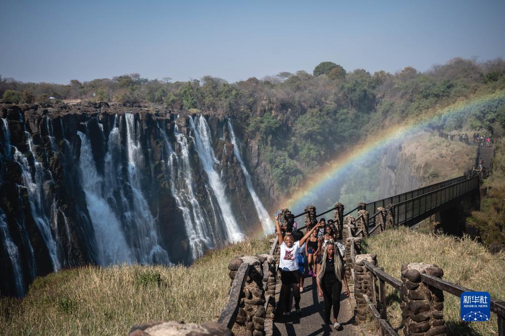 游客在贊比亞觀(guān)賞維多利亞瀑布景色(2023年8月21日攝)。