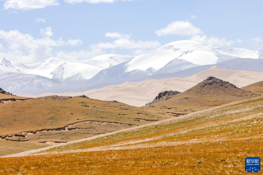 9月12日在阿爾金山國家級自然保護區拍攝的集草原、沙漠、雪山于一體的自然景觀(guān)。
