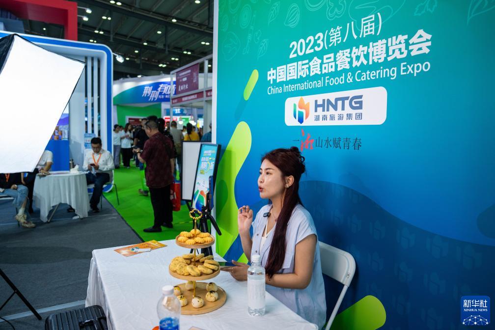9月15日,在長(cháng)沙國際會(huì )展中心,參展商通過(guò)直播推銷(xiāo)糕點(diǎn)。