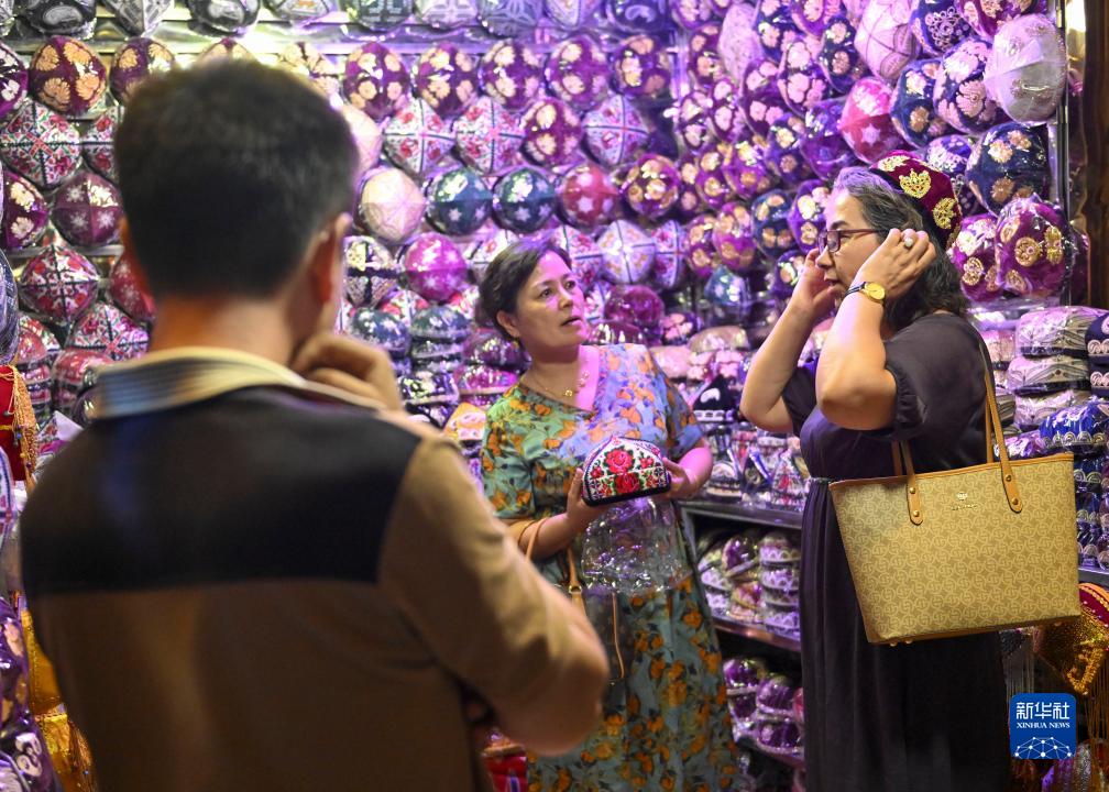 9月14日晚,游客在新疆喀什古城景區選購帽子。