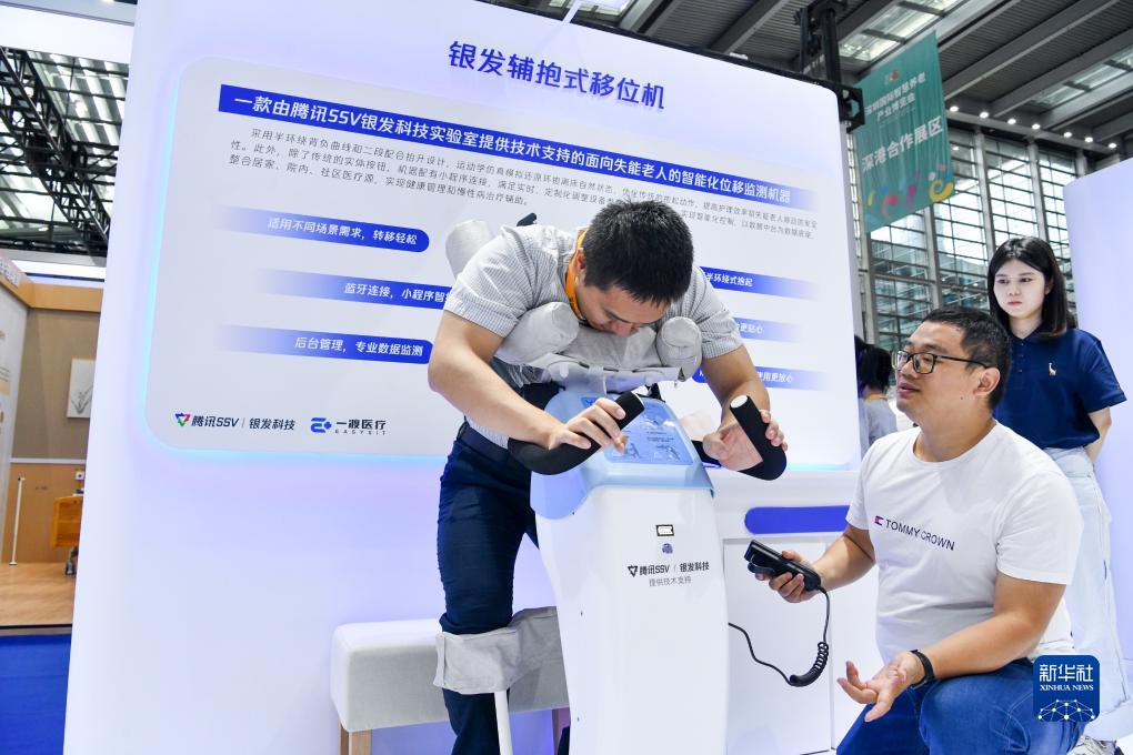 9月15日,觀(guān)眾在深圳智慧養老展上體驗失能老人智能化照護產(chǎn)品——銀發(fā)輔抱式移位機。