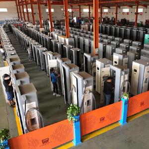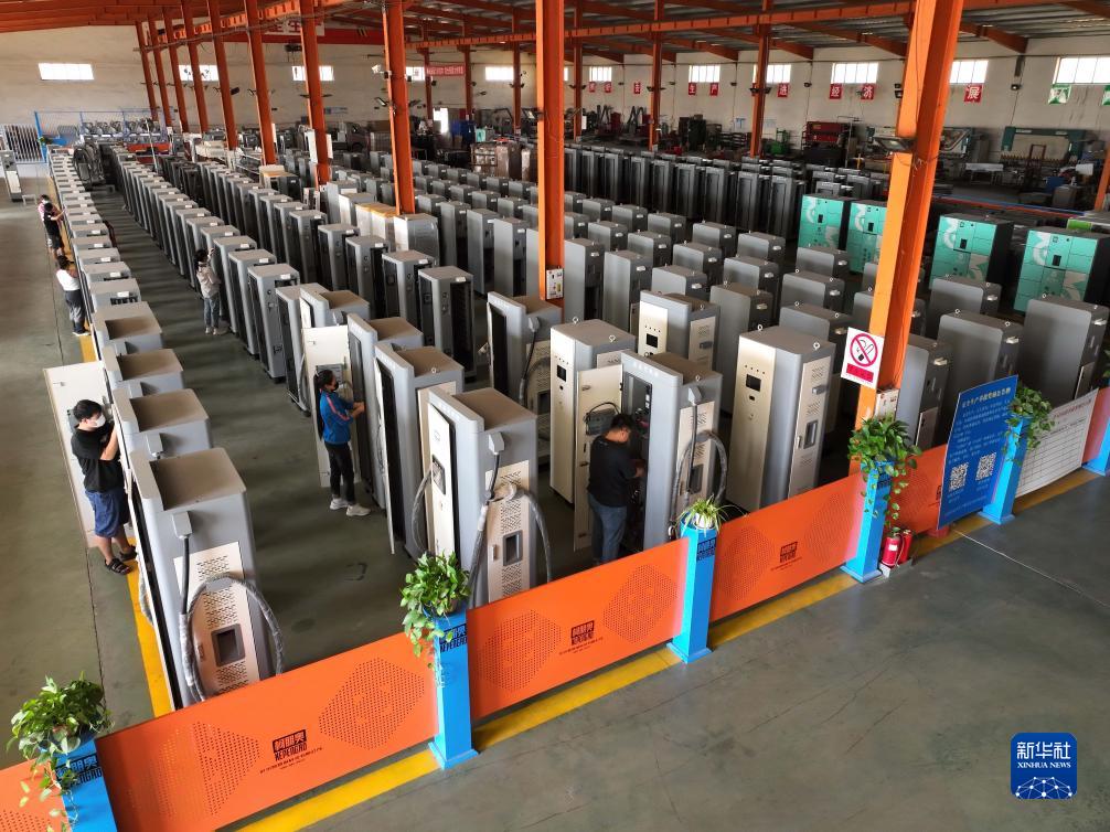 9月15日,工作人員在滄州智慧城科技有限公司生產(chǎn)車(chē)間對直流充電樁進(jìn)行安裝與檢測(無(wú)人機照片)。
