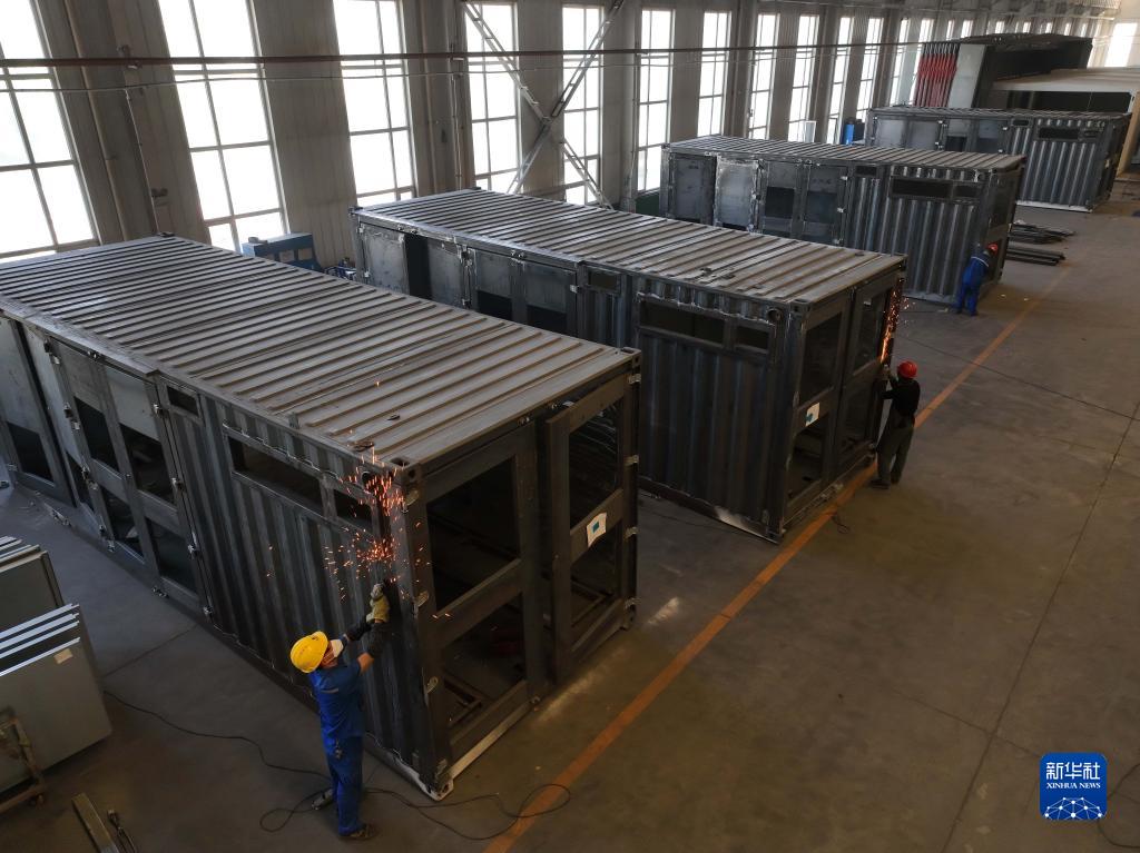 9月15日,工作人員在河北科源智能電氣有限公司生產(chǎn)車(chē)間對換電箱半成品進(jìn)行打磨處理(無(wú)人機照片)。