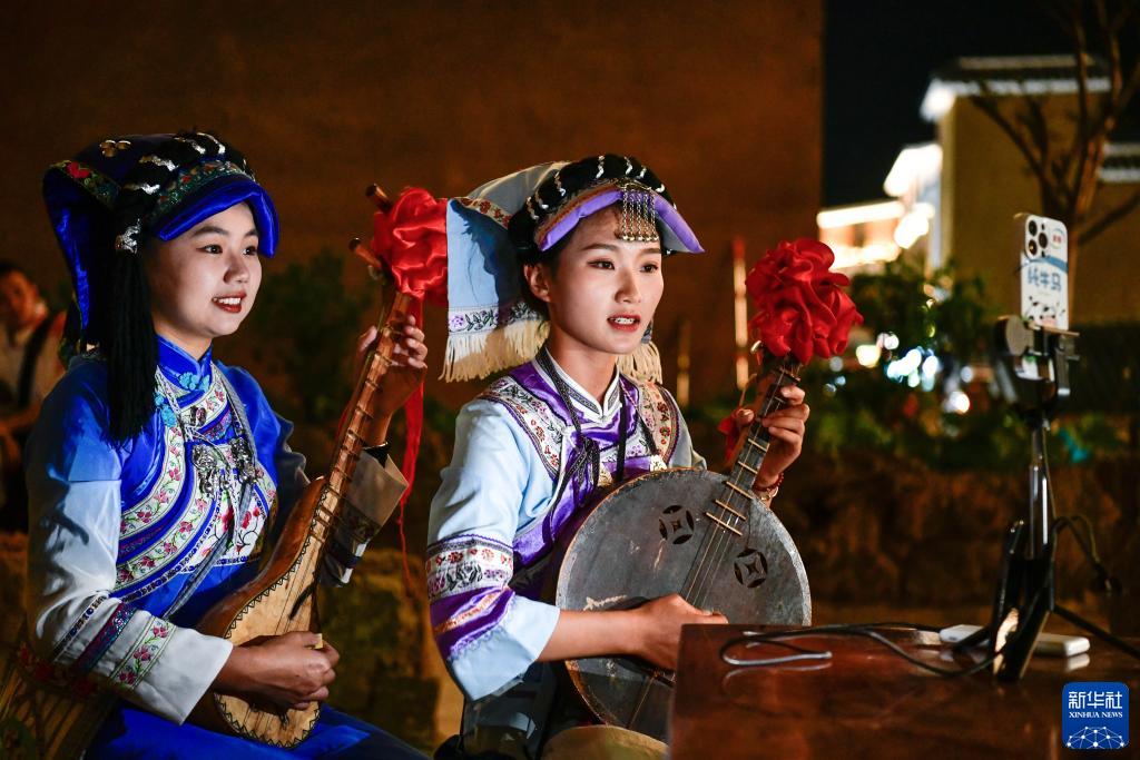 9月14日,少數民族姑娘在興義市萬(wàn)峰林街道的“鄉愁集市”直播民族樂(lè )器彈唱。
