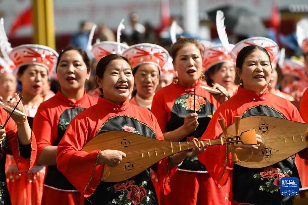 9月15日,在四川省阿壩藏族羌族自治州馬爾康市,演員在街頭表演非遺項目。