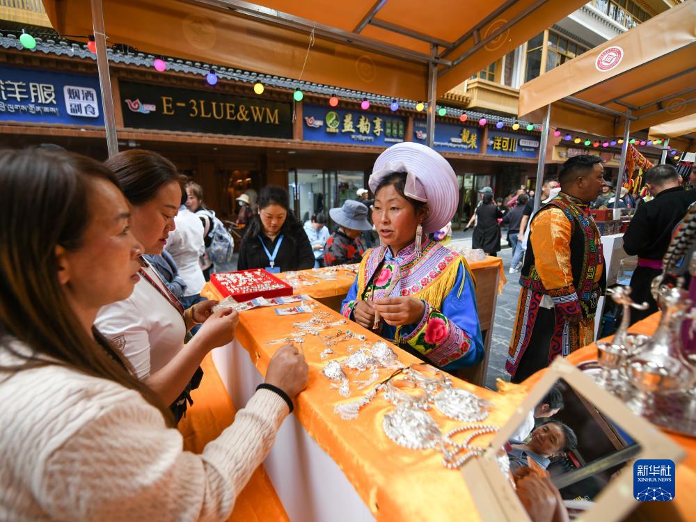 9月15日,在四川省阿壩藏族羌族自治州馬爾康市嘉絨特色街區,游客在非遺集市上選購商品。
