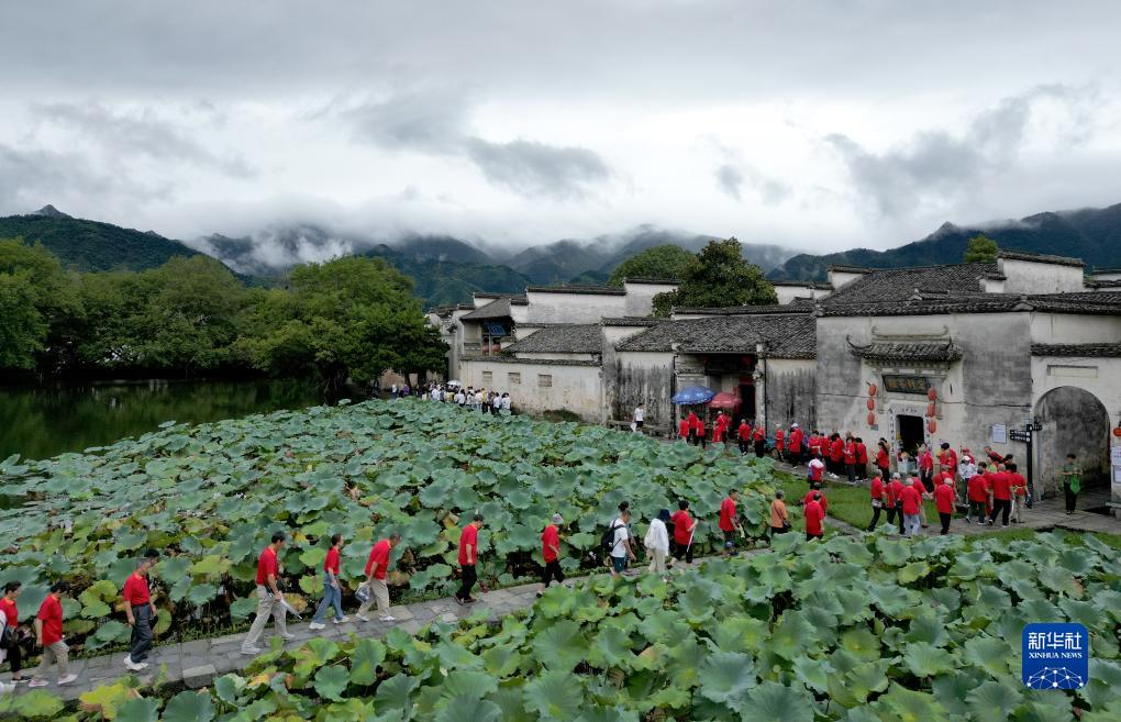 這是游客們在黃山市黟縣宏村內游覽(9月13日攝,無(wú)人機照片)。
