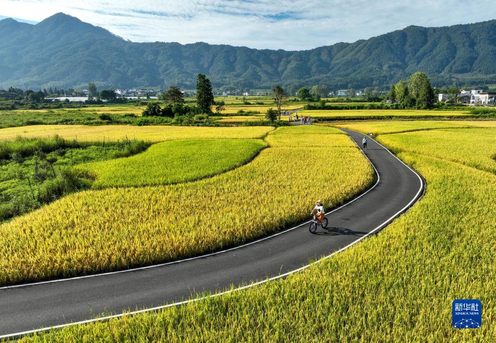 一位游客在黃山市黟縣碧陽(yáng)鎮關(guān)麓古村附近騎行(9月2日攝) 。