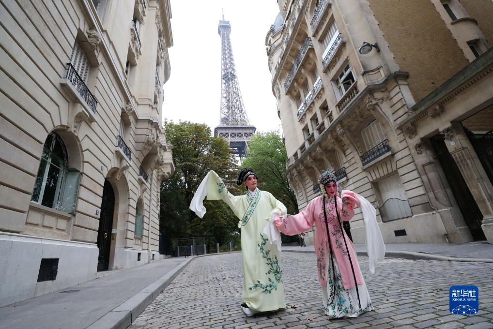 9月13日,江蘇省演藝集團昆劇院院長(cháng)施夏明(左)和江蘇省演藝集團昆劇院國家一級演員孔愛(ài)萍在法國巴黎埃菲爾鐵塔附近參加昆曲快閃。