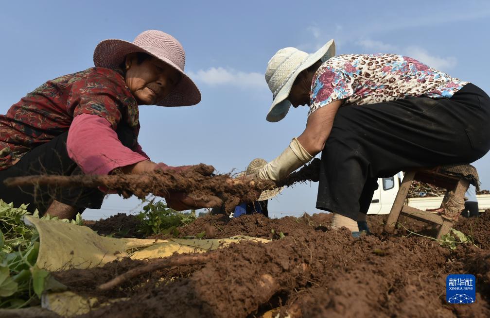 9月15日,河南省焦作市溫縣黃莊鎮米莊村農民在田間收獲鐵棍山藥。