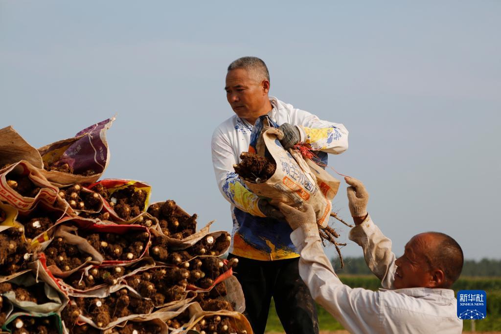 9月15日,河南省焦作市溫縣黃莊鎮米莊村農民在田間搬運剛收獲的鐵棍山藥。