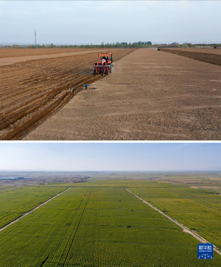 這是一張拼版照片,上圖是農民在寧夏吳忠市同心縣韋州鎮鋪設滴灌帶(資料圖片,2023年4月20日攝);下圖是9月14日拍攝的位于寧夏吳忠市同心縣韋州鎮現代高效節水灌溉項目建成后的高標準農田(無(wú)人機照片,新華社記者楊植森攝)。