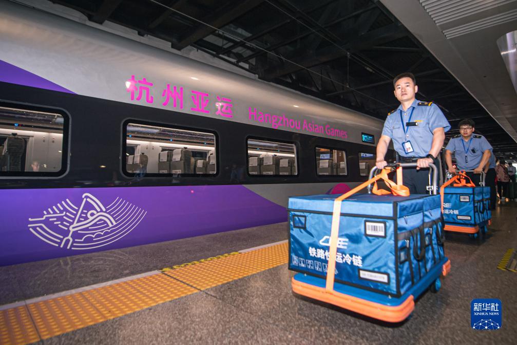 9月16日,中鐵快運工作人員準備將冷鏈運輸的杭州亞運會(huì )興奮劑檢查樣本運上復興號亞運智能動(dòng)車(chē)組列車(chē)。