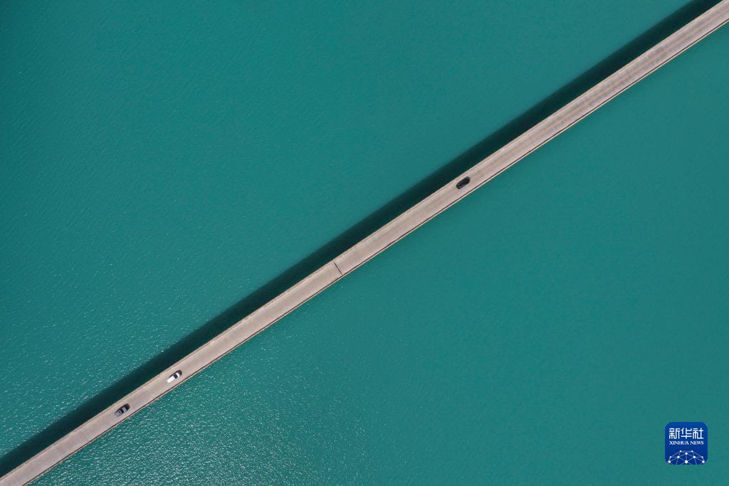 游客駕車(chē)穿行在新疆塔什庫爾干塔吉克自治縣“班迪爾藍湖”上方的大橋上(8月28日攝,無(wú)人機照片)。