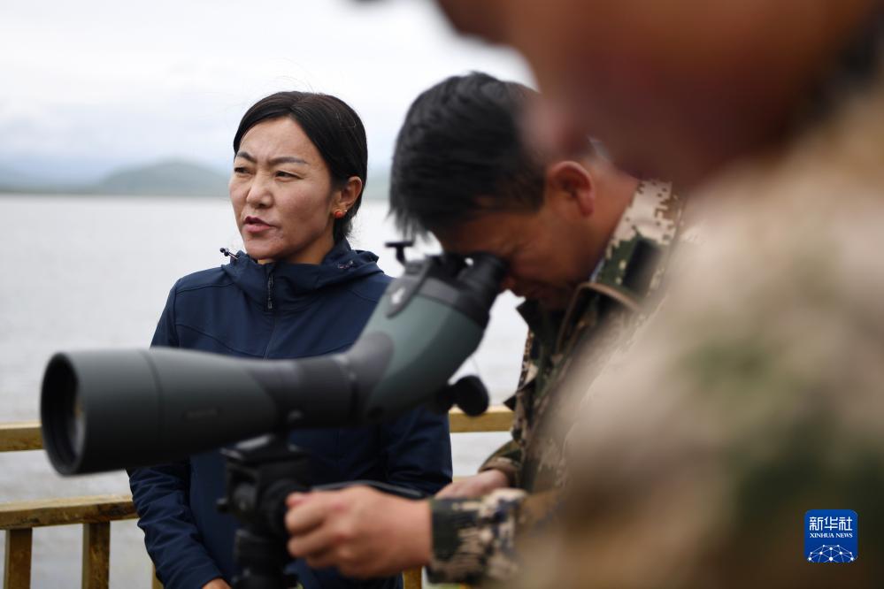 甘肅尕海則岔國家級自然保護區管護中心尕海保護站站長(cháng)香毛吉(左一)和同事在保護區內用望遠鏡觀(guān)測野生動(dòng)物(7月7日攝)。