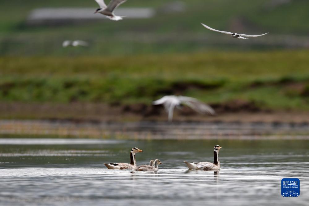 斑頭雁在甘肅尕海則岔國家級自然保護區尕海湖的水面上游弋(7月7日攝)。
