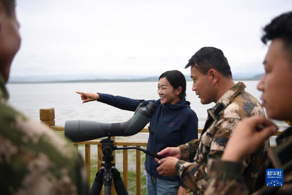 甘肅尕海則岔國家級自然保護區管護中心尕海保護站站長(cháng)香毛吉(右三)和同事在保護區內巡護(7月7日攝)。
