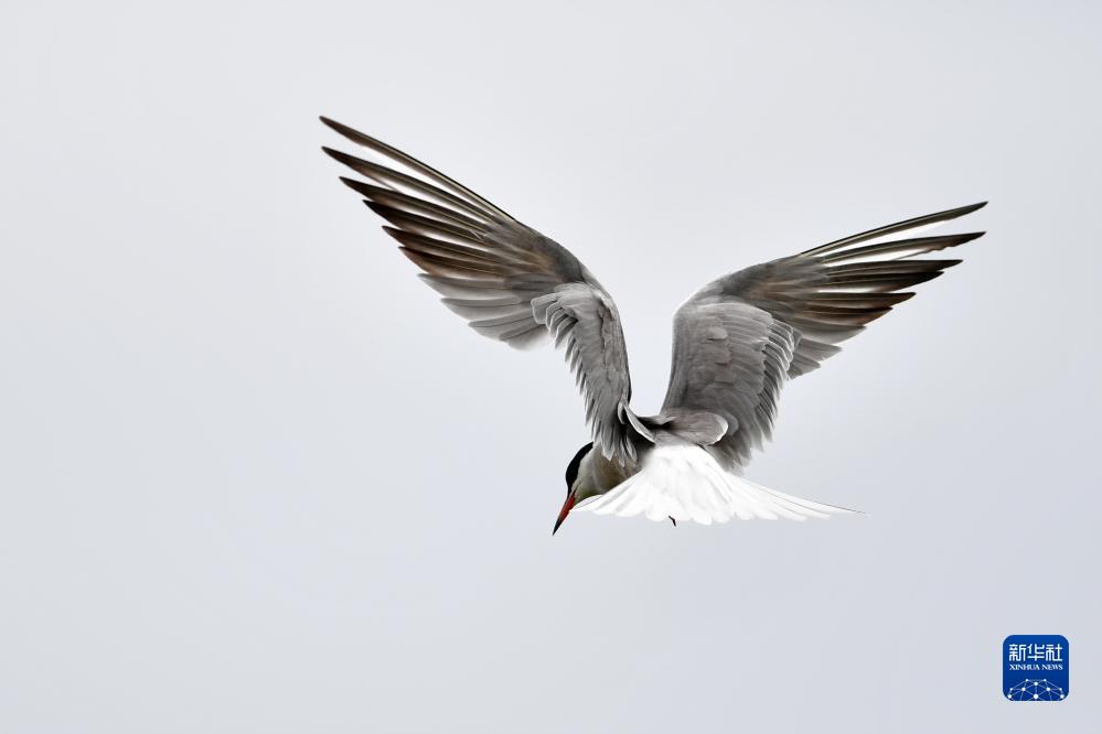 一只燕鷗在甘肅尕海則岔國家級自然保護區的尕海濕地上飛翔(7月7日攝)。