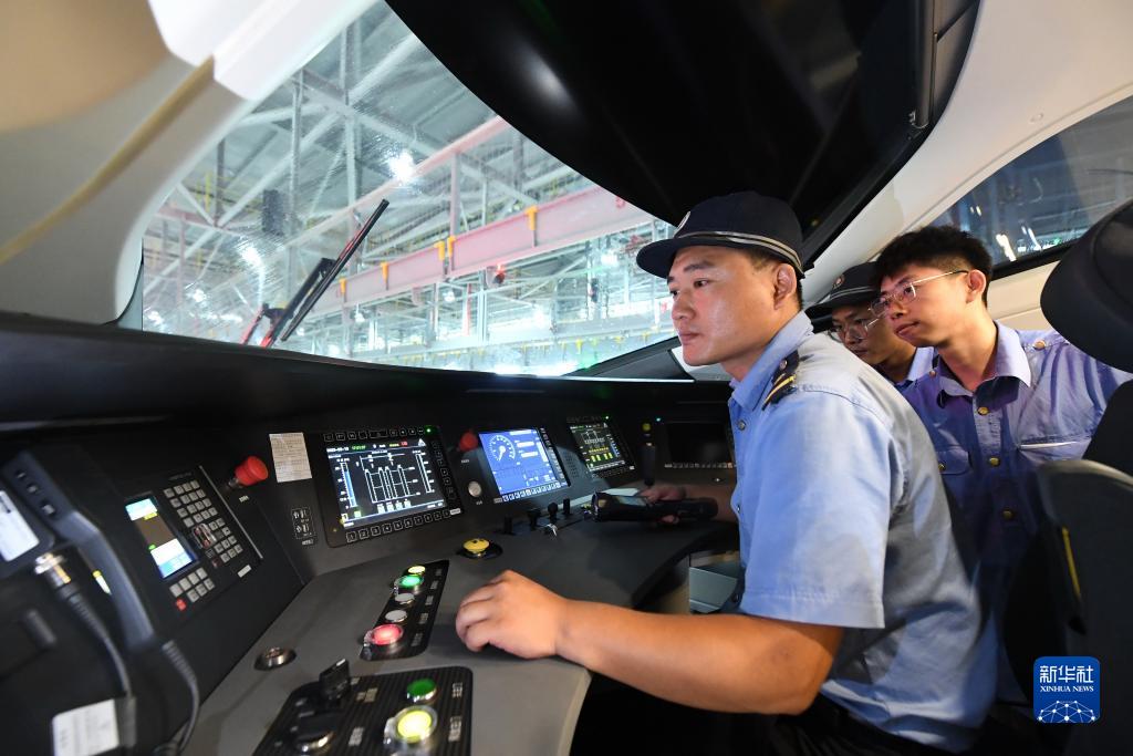 9月13日,高春成(左)和同事在復興號智能配置動(dòng)車(chē)組司機室檢測動(dòng)車(chē)系統狀態(tài)。