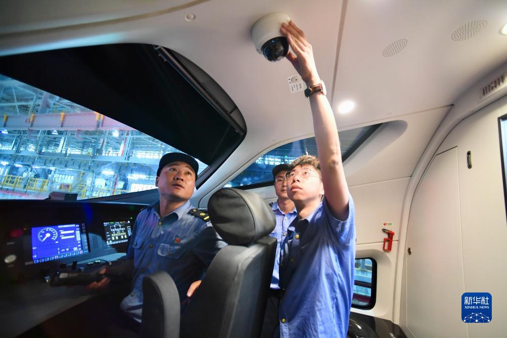 9月13日,高春成(左)與同事在對執行福廈高鐵運行試驗任務(wù)的復興號智能配置動(dòng)車(chē)組進(jìn)行駕駛室檢查。
